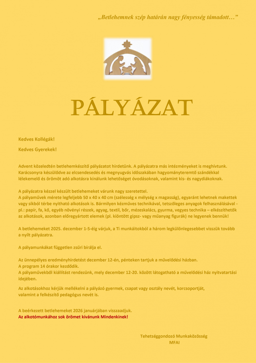 Advent közeledtén betlehemkészítő pályázatot hirdetünk. A pályázat pontos leírása elolvasható itt!