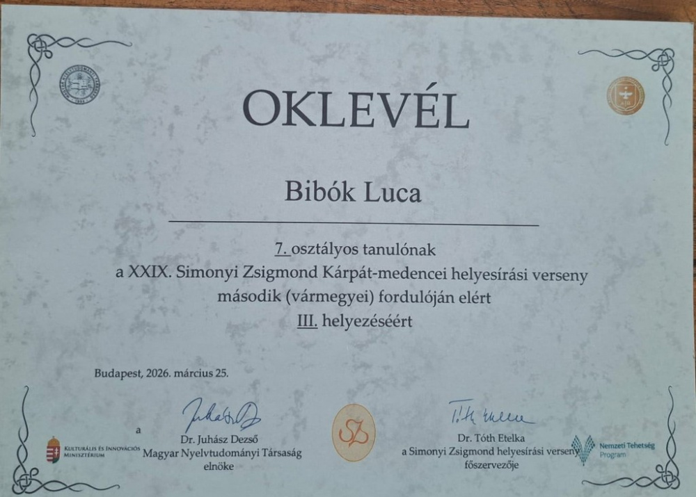 Lezárult a XXIX. Simonyi Zsigmond Kárpát-medencei helyesírási verseny megyei fordulója. A verseny célja az anyanyelv értékeinek megőrzése, az anyanyelv iránti szeretet erősítése, a tehetséggondozás, a tehetséges tanulók és a pedagógusok közötti Kárpát-medencei kapcsolatok támogatása. Célja továbbá a továbbtanuláshoz, a mindennapi élethez szükséges helyesírási készség fejlesztése, a helyesírási ismeretek bővítése, a helyesírási problémaérzékenység, valamint a digitális írástudás fejlesztése.