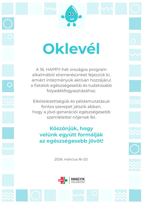 Idén 16. alkalommal kerül megrendezésre a vízivást népszerűsítő HAPPY-hét, melyet tavaly1347 intézményben rendeztek meg, intézményünk ebben az évben is csatlakozott a programhoz. A HAPPY-hét eseményei 2026. március 16-20. között zajlottak.