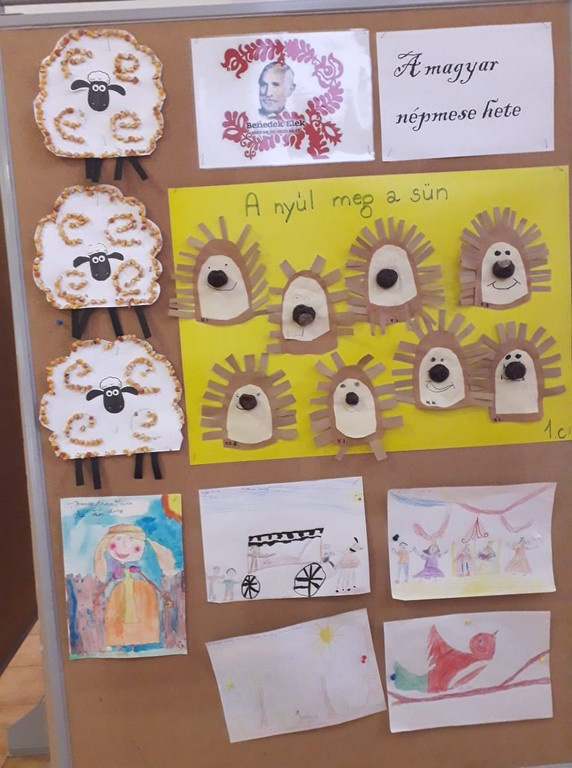 Az alsós évfolyamok pedig népmeséket hallgathattak tanítójuktól. Változatos tevékenységek kapcsolódtak a meséléshez. Voltak, akik meseszereplők bőrébe bújtak. Az 1.b A bolhabőr cipő c. magyar népmesét dramatizálta. Melyet illusztráltak és gyurmával is megformáztak. Az 1.c kukoricamorzsolással kezdte a mesehetet, melyből az aranyszőrű bárányt formázták meg. A 3.b osztály több mesét is meghallgatott a héten, majd kedvenc meséjük –Az okos leány- szereplőit síkbábból készítették el. A 4.a osztály a tündérmesék világában tett különleges látogatást. Az elkészült munkákból kiállítást állítottunk össze az iskola aulájában.